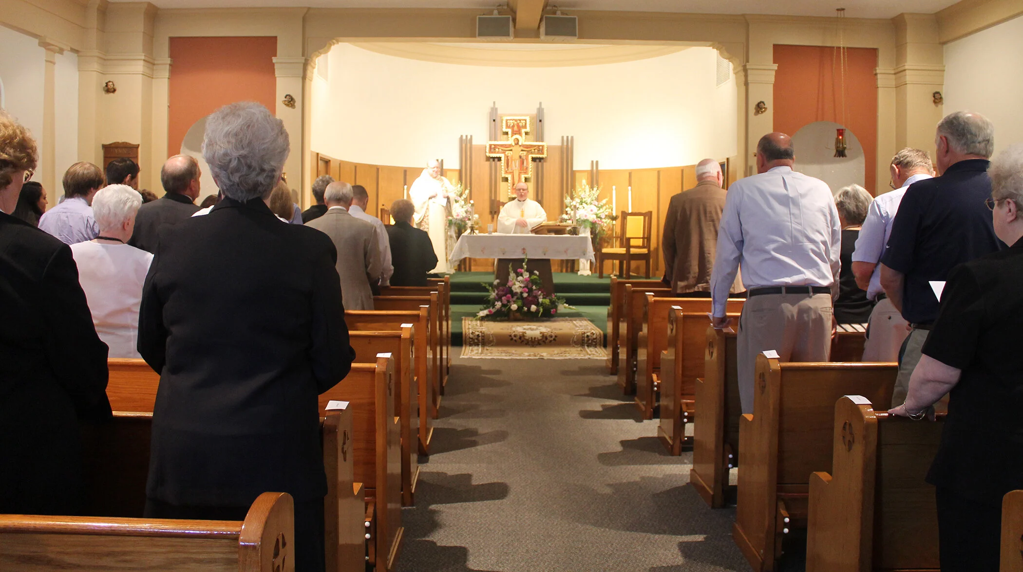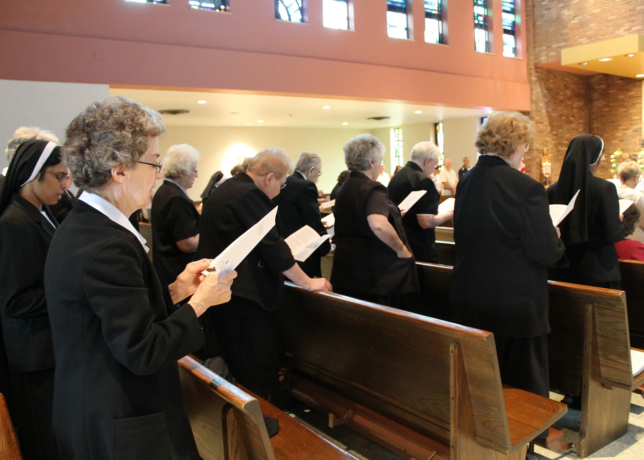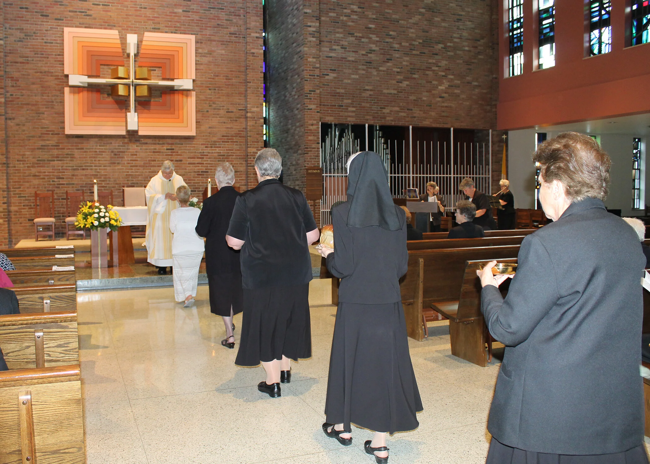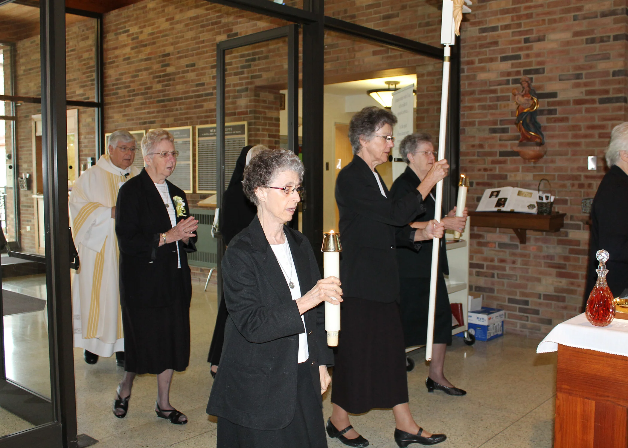 Sisters Pat Brennan, Ruth Zacharias (hidden), Karen Buco, Regina Ann Rokosny and Loretta Motko enter Our Lady of Angels Chapel at Mount Assisi Convent ahead of Father Richard Lelonis.