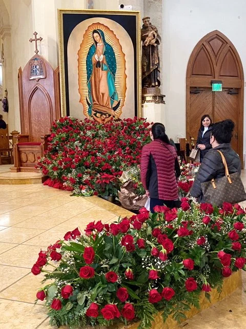 On December 12, Sisters Hilda Marotta and Adelina Garcia attended Mass at San Fernando Cathedral in San Antonio, Texas, where the sanctuary was decorated with roses for the Feast of Our Lady of Guadalupe.