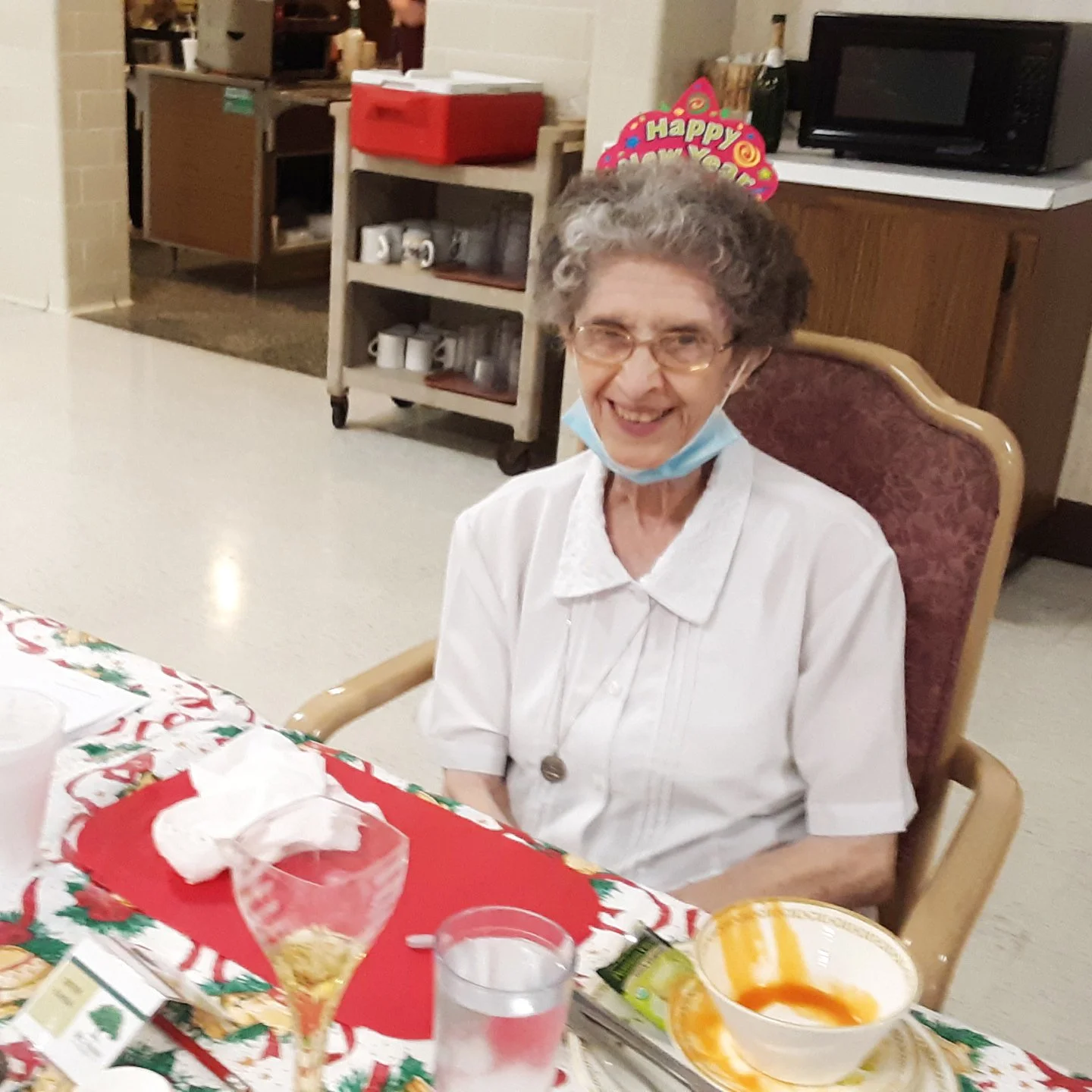 Sister Virginia Rose Carroll makes a festive entrance to the Mt. Assisi Place Resident Christmas Party on December 10.