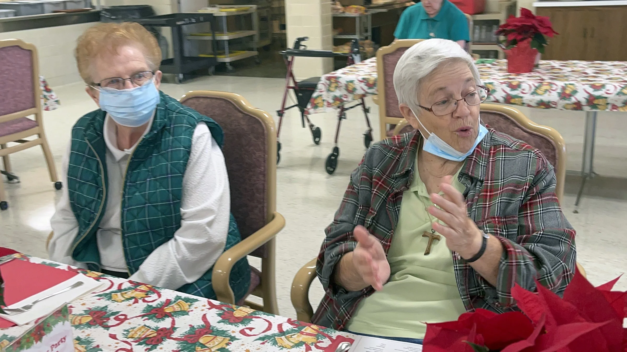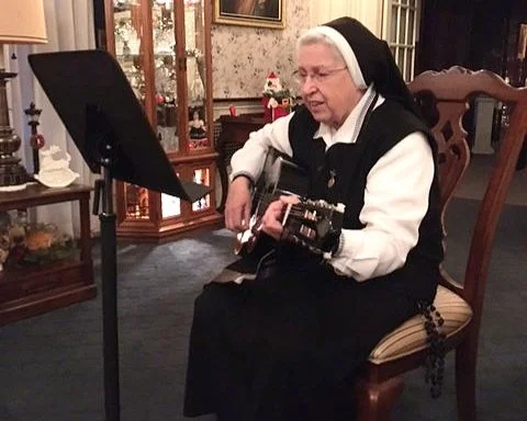 Sister Mary Martha plays Christmas songs on guitar, setting a musical backdrop for the Sisters’ Christmas celebration at Monocacy Manor.