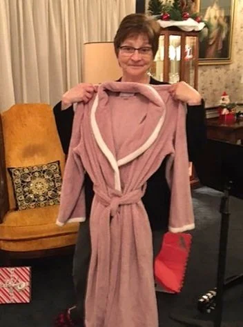 Sister Barbara Brown models a robe she received during the Christmas gift exchange at Monocacy Manor.
