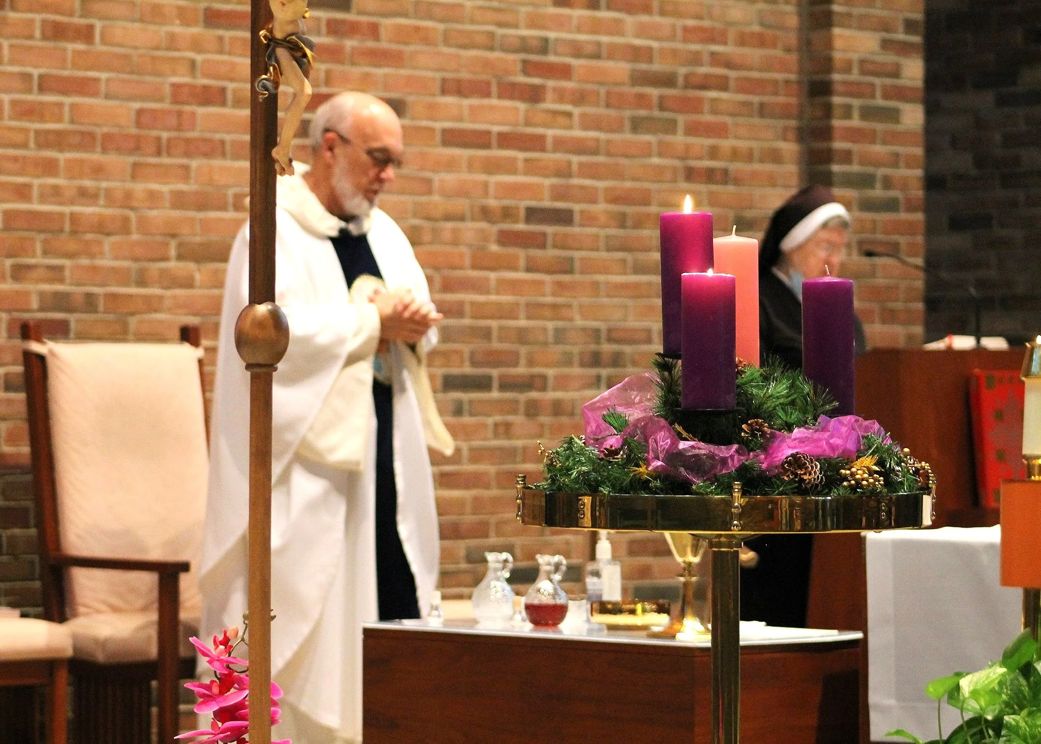 The Advent wreath illuminates the chapel at Mt. Assisi Place, as Father Richard Zelig prays and Sister Jeanne Marie Ulica reads during Mass.