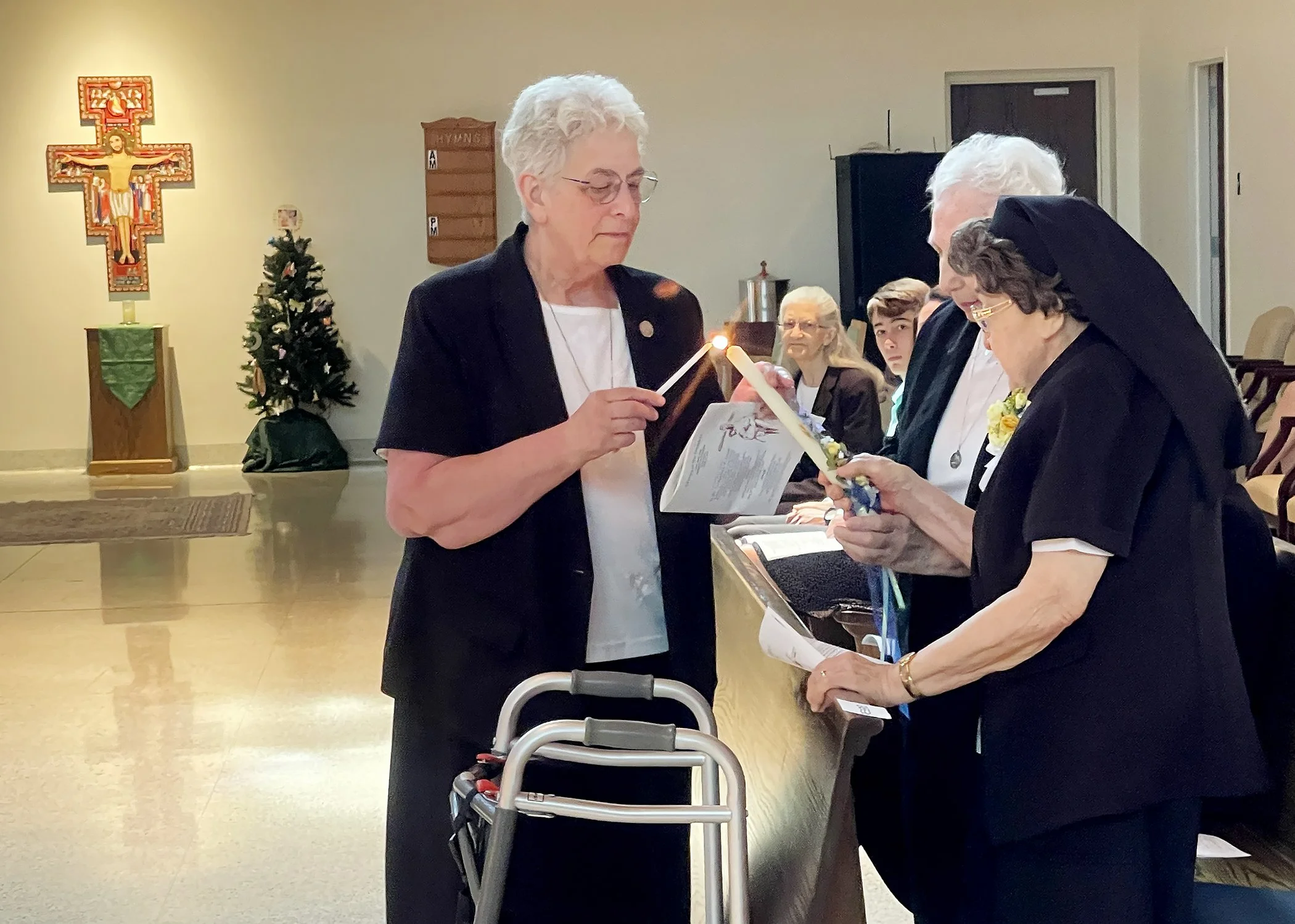 Sister Marian Sgriccia, provincial minister of the School Sisters of St. Francis, lights a candle during the 2024 Jubilee Mass.