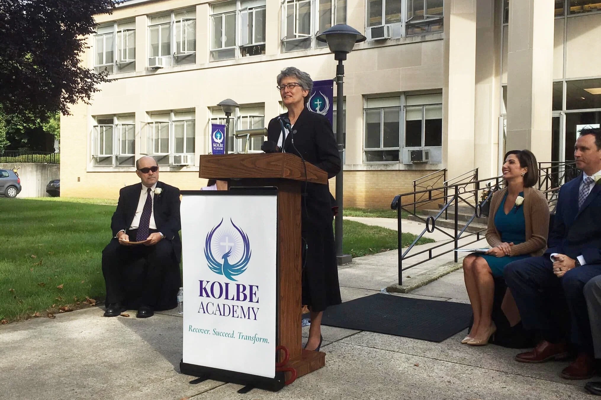 “When I walked off the stage and out the doors of Mullen Hall in 1974 as a graduate of St. Francis Academy, I never dreamed that 45 years later I would stand before these same doors to welcome another academy,” Sister Bonnie Marie told those gathered for the grand opening of Kolbe Academy on August 26, 2019.