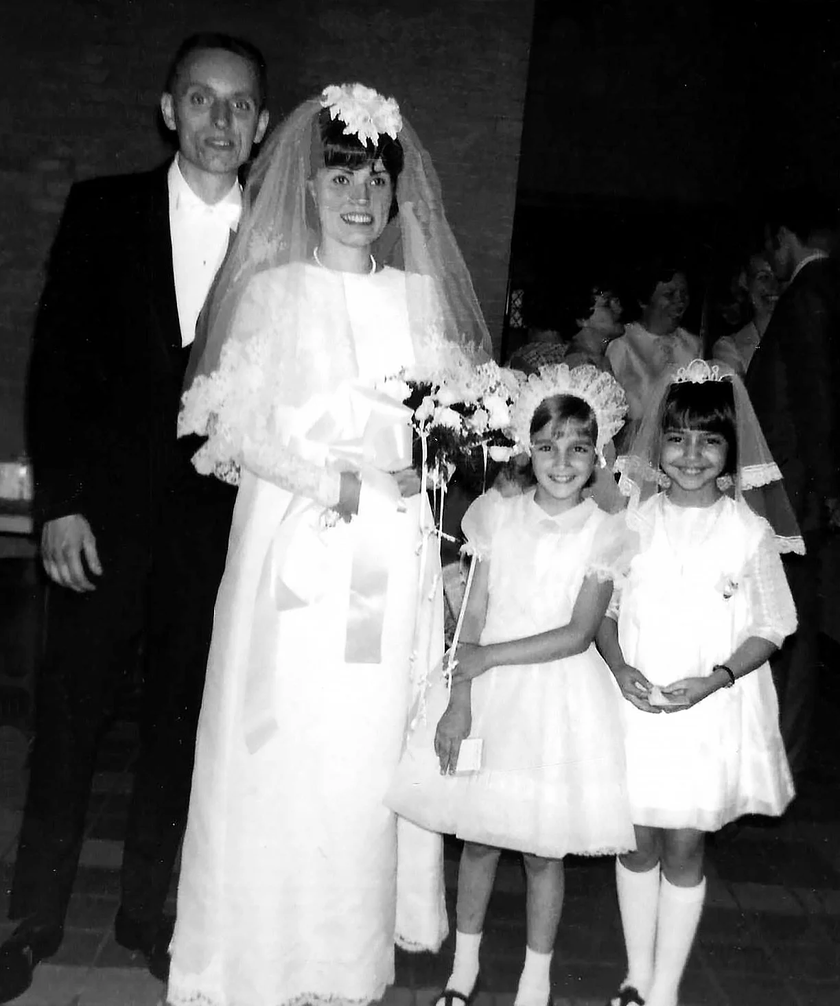 Ernie and Phyllis Fassio on their wedding day in 1969, accompanied by Phyllis’ former students. At right is Mary Theresa Graziano, who, just like Phyllis, went on to attend Mount Assisi Academy.