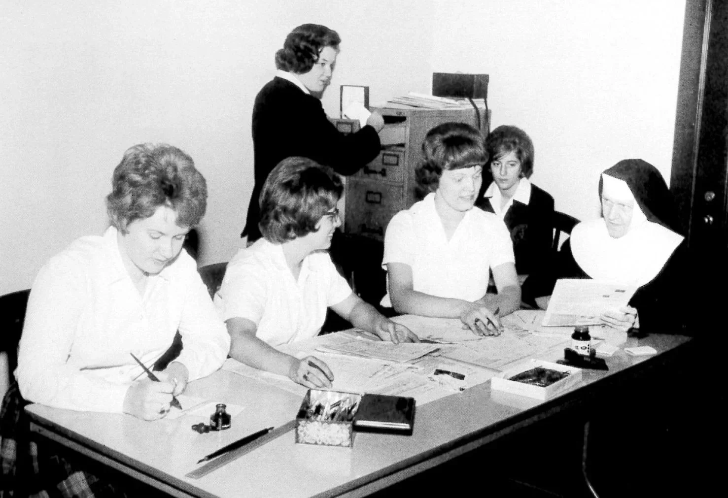 Sister Agnes Cvala advises the Echoes newspaper staff in 1965, including Phyllis Balkovitz (seated next to Sister).